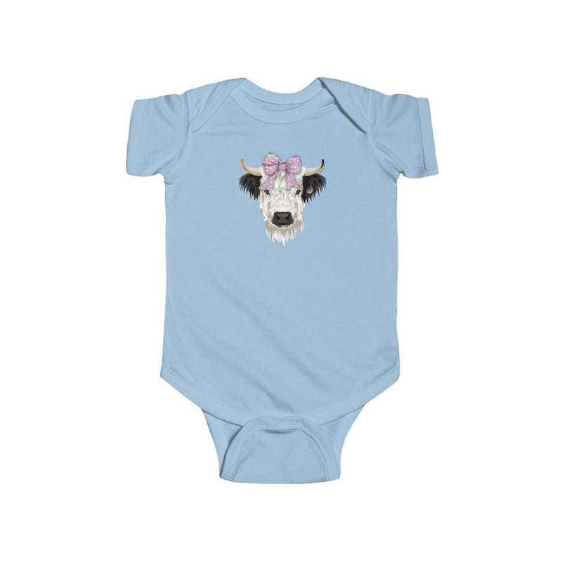 This infant onesie features the mini cow Poppy. Bring a piece of the mini farm with you every day! The fabric is 100% cotton for solid colors. For heather colors, polyester is included. There are seams along the sides of this product. All bindings are made with ribbed knitting for improved durability. There are plastic snaps at the cross closure for easy changing access.